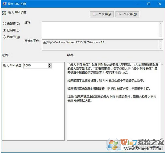 4、若想設置最大PIN長度,則點擊最大PIN長度項,在接下來彈出的窗口中,選擇已啟用,然后在下方的選項中,將最大PIN長度設置為你的期望值,最后,點擊窗口右下角的確定按鈕。