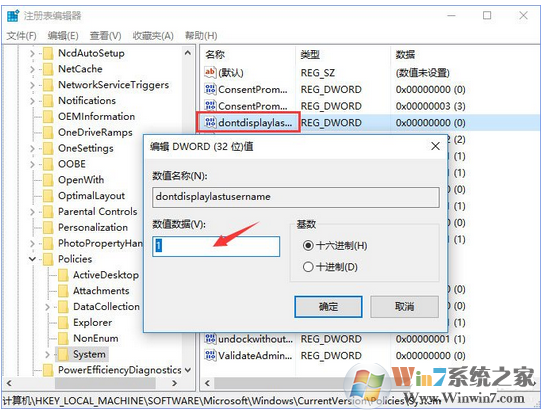 2、定位到以下位置:\HKEY_LOCAL_MACHINE\SOFTWARE\Microsoft\Windows\CurrentVersion\Policies\System\,找到名為dontdisplaylastusername的鍵值,雙擊它,然后將它的數(shù)值數(shù)據(jù)改為1。