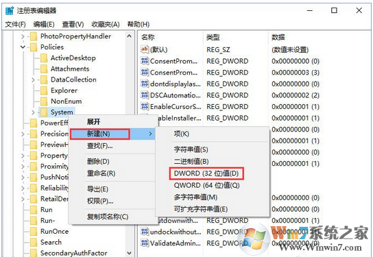 3、將鼠標(biāo)光標(biāo)放在左側(cè)樹狀列表的System項上,單擊右鍵,選擇新建-DWORD(32位)值,并將該值命名為:DontDisplayLockedUserID。