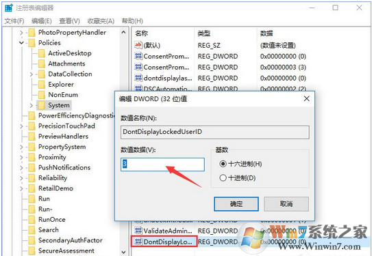 4、雙擊我們剛剛新建的名為DontDisplayLockedUserID的DWORD(32位)值,你將看到一個編輯DWORD(32位)值的窗口。在這個窗口中,將DontDisplayLockedUserID的數(shù)值數(shù)據(jù)改為3。