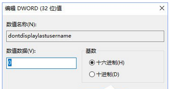 要將Win10登陸界面恢復(fù)為顯示姓名也非常簡單,只需再次來到注冊表,然后雙擊名為dontdisplaylastusername的鍵值,將它的數(shù)值數(shù)據(jù)改為0即可。