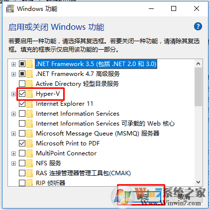 4、將虛擬機(jī)服務(wù)Hyper-V前的打勾去掉,點(diǎn)擊確定。