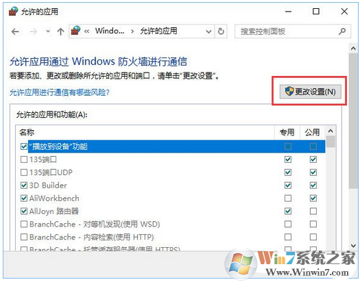 4、在Windows防火墻 - 允許應(yīng)用窗口,點(diǎn)擊:更改設(shè)置,如圖下:
