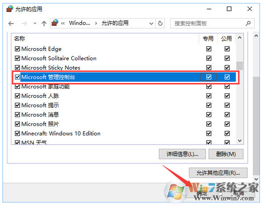 9、我們可以看到mmc.exe已經(jīng)添加到允許的應(yīng)用和功能列表中,將“專(zhuān)用”和“公用”的復(fù)選框都勾選,點(diǎn)擊確定保存即可!