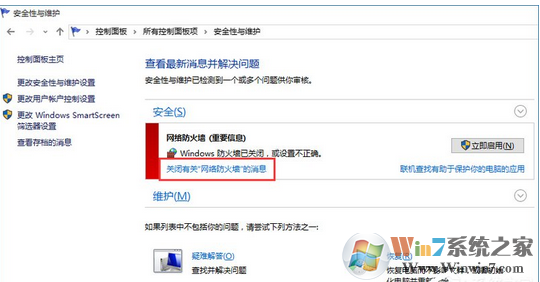 4、打開安全性與維護界面后,安全菜單里會有網(wǎng)絡(luò)防火墻的信息,點擊關(guān)閉有關(guān)“網(wǎng)絡(luò)防火墻”的消息,關(guān)閉后就不會再有通知了。