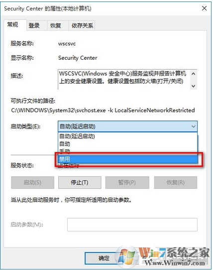 3、雙擊打開SecurityCenter屬性,停止該服務(wù)并設(shè)置啟動類型為“禁用”。