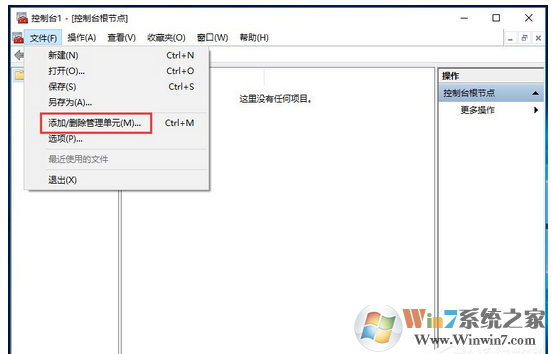 4、待打開“控制臺(tái)”界面后,點(diǎn)擊“文件”-“添加/刪除管理控制單元”項(xiàng),設(shè)置并添加相關(guān)控制單元;