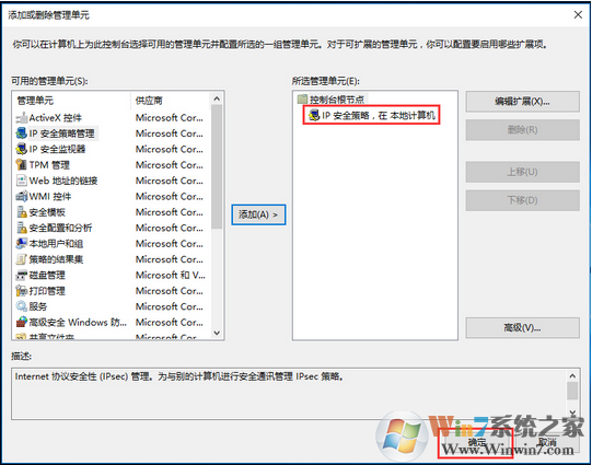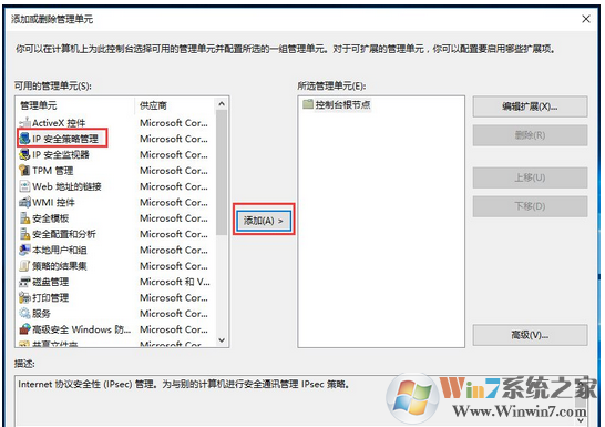 5、從打開的“添加或刪除管理單元”窗口中,就可以根據(jù)自己的實(shí)際需要選擇并添加相關(guān)控制單元;