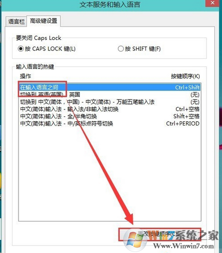 4、輸入語(yǔ)言的熱鍵下面選擇在輸入語(yǔ)言之門,再點(diǎn)更改按鍵順序