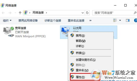 2、一般會有“以太網(wǎng)”和“WLAN”也就是有線和無線了,有線則選“以太網(wǎng)”,無線則選擇“WLAN”,右鍵點擊,選擇屬性;
