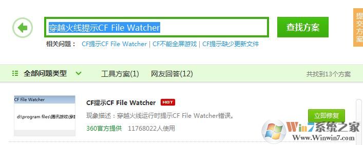 2、在搜索框中輸入:穿越火線提示CF File Watcher 點擊【查找方案】按鈕即可完成修復!