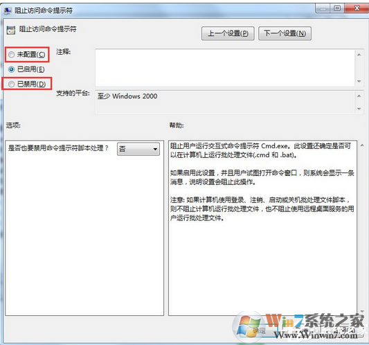 4、將阻止訪問命令提示符狀態(tài)更改為未配置或者已禁用,并確定生效,如圖所示: