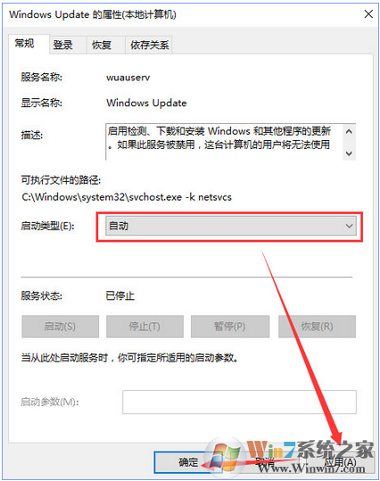 3、如果打開后和小編這里顯示的一樣,服務(wù)已停用,那么先將啟動(dòng)類型修改為【自動(dòng)】,然后點(diǎn)擊【應(yīng)用】【確定】即可,以此類推,確保Windows Firewall,Windows License Manager Service,Network Connection Broker,Windows Store Service (WSService)幾個(gè)服務(wù)都已正常啟動(dòng);