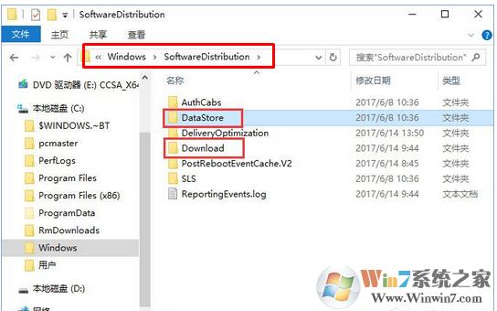 5、打開此電腦,依次展開C:\Windows\SoftwareDistribution 文件夾,在SoftwareDistribution 文件夾中刪除DataStore文件夾下的內(nèi)容和Download文件夾下的內(nèi)容(若出現(xiàn)無(wú)法刪除的現(xiàn)象,可參考方法1、2 、3將Windows Update 服務(wù)暫停,然后即可進(jìn)行刪除,刪除后重新啟用Windows update服務(wù)即可)。