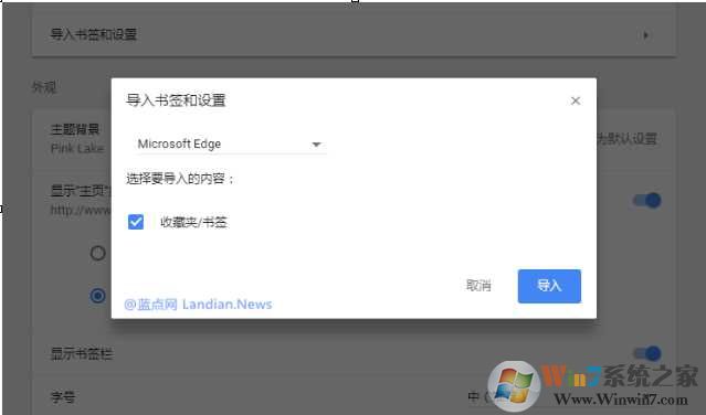 2、點(diǎn)擊Google Chrome瀏覽器的設(shè)置然后導(dǎo)入書簽和設(shè)置,選擇從Microsoft Edge瀏覽器導(dǎo)入即可;