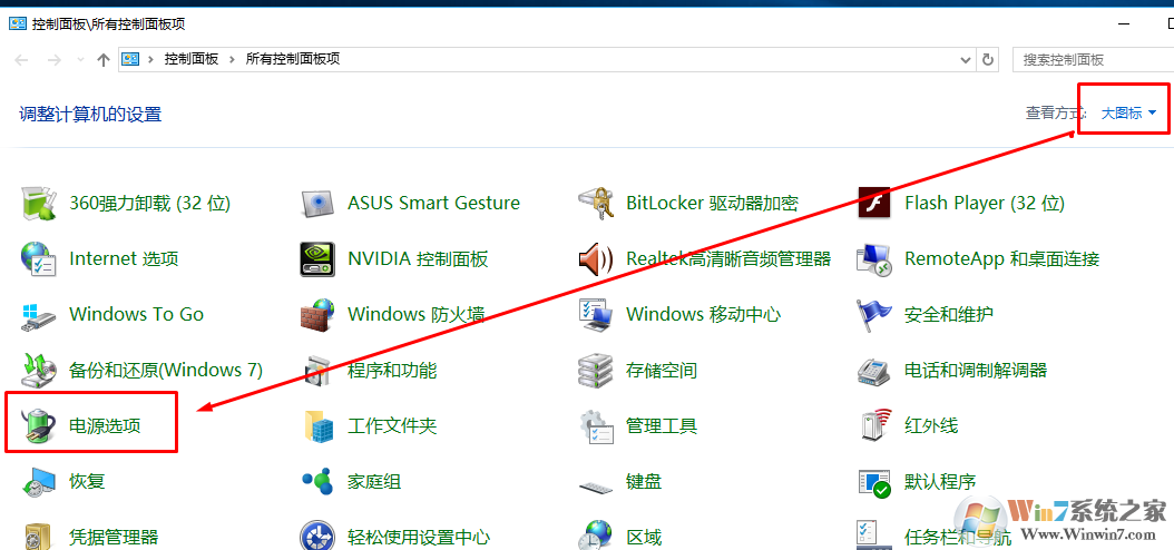 2、選擇大圖標(biāo)+----電源選項(xiàng)