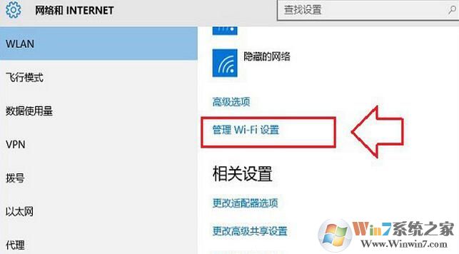 3、接下來點(diǎn)擊左側(cè)的“WLAN”設(shè)置選項(xiàng),然后再右側(cè)再找到,并點(diǎn)擊進(jìn)入“管理WiFi設(shè)置”。