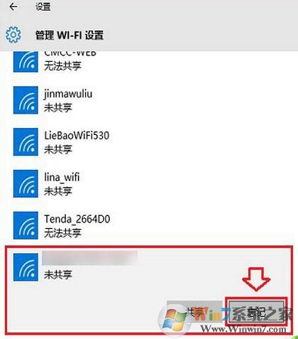 4、最后下拉找到這個無法連接此網(wǎng)絡(luò)的Wifi,點(diǎn)擊www.winiwn7網(wǎng)絡(luò)名稱,然后在右下角顯示出來的操作上,點(diǎn)擊“忘記”選項(xiàng)。