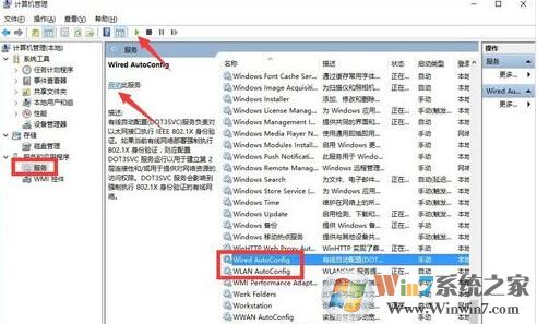 11、從打開的“計算機管理”窗口上,依次展開“服務(wù)和應(yīng)用程序”-“服務(wù)”項,找到“Wired AutoConfig”和“WLAN AutoConfig”兩個服務(wù)項,確保這兩個服務(wù)項處于正常運行狀態(tài),否則點擊左上角的“啟動此服務(wù)”按鈕以開啟此服務(wù)。
