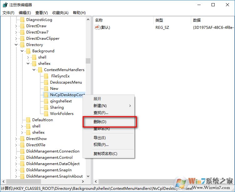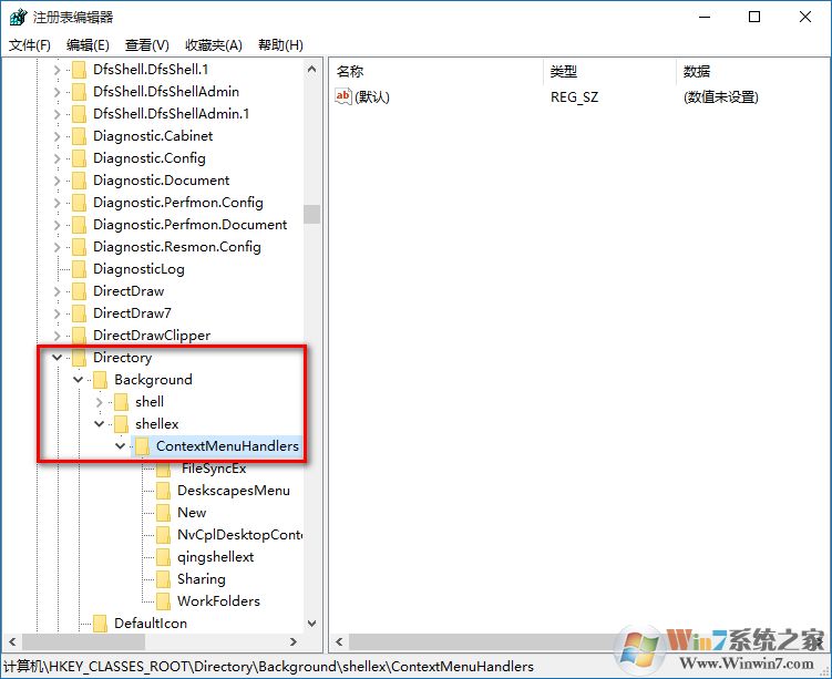 5、雙擊,找到HKEY_CLASSES_ROOTDirectoryBackgroundshellexContextMenuHandlers