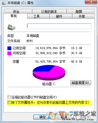 3、取消索引勾選,點(diǎn)擊確定。有時(shí)候可能會(huì)需要你以管理員權(quán)限操作,執(zhí)行管理員權(quán)限即可。