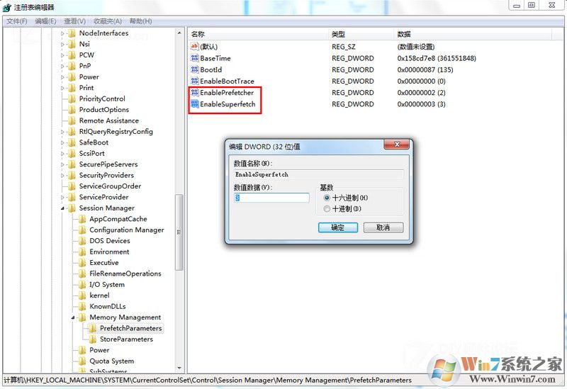 1、進(jìn)入注冊(cè)表,找到HKEY_LOCAL_MACHINESYSTEMCurrentControlSetControlSessionManagerMemory ManagementPrefetchParameters