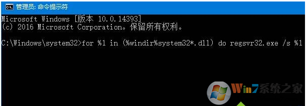 2、在命令提示符框中輸入:【for %1 in (%windir%system32*.ocx) do regsvr32 /s %1】 按下回車鍵,接著在命令提示符框中輸入【for %1 in (%windir%system32*.dll) do regsvr32.exe /s %1】 按下回車鍵,等待屏幕滾動(dòng)完之后重啟計(jì)算機(jī);