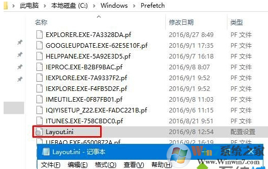 3、打開計(jì)算機(jī),打開:C:\Windows\Prefetch,然后雙擊打開“Layout.ini”,將里面的所有內(nèi)容清空,保存。
