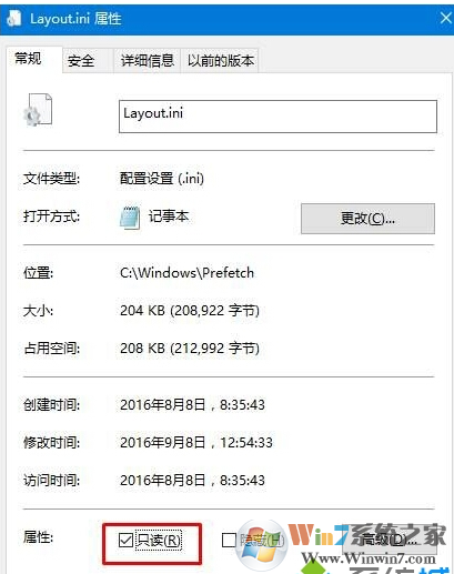 4、在“Layout.ini”文件上單擊右鍵,選擇屬性,勾選“只讀”,然后點(diǎn)擊應(yīng)用并確定。