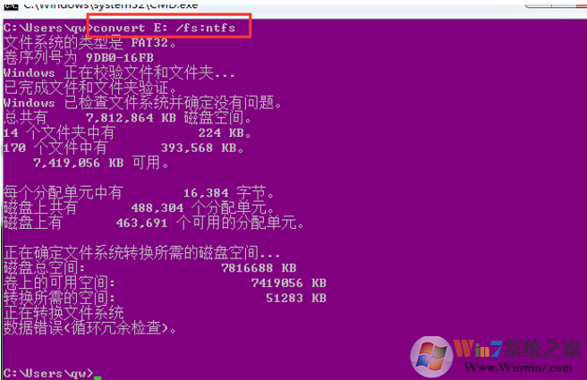 2.cmd進(jìn)入命令行,假設(shè),優(yōu)盤顯示盤符是E,則執(zhí)行命令:convert E: /fs:ntfs