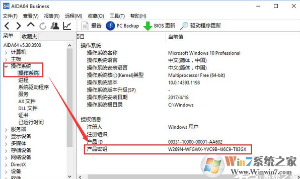 3、在左側(cè)樹狀菜單點(diǎn)擊 【操作系統(tǒng)】-【操作系統(tǒng)】,在右側(cè)我們就可以清楚的看到產(chǎn)品密鑰,后面就是激活碼了。