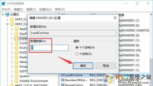 2、依次展開HKEY_CURRENT_USER\Console,在右側(cè)雙擊打開LoadConIme值,將其數(shù)值數(shù)據(jù)修改為“0” 點(diǎn)擊確定保存設(shè)置重啟計(jì)算機(jī)即可!