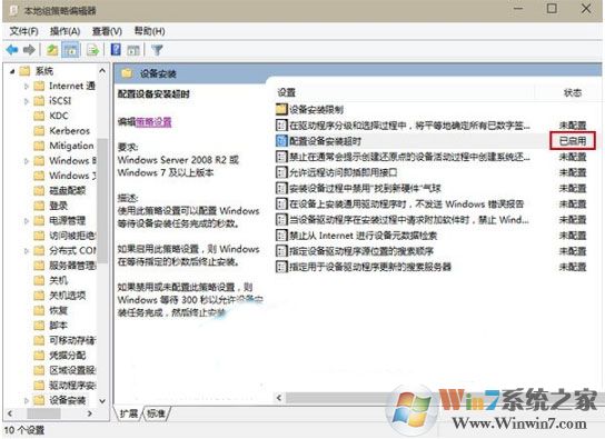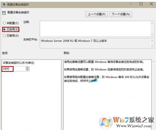 3、在窗口左上方選擇“已啟用”,然后在左邊中間位置“設備安裝超時”中設定“1800”秒后單擊確定。
