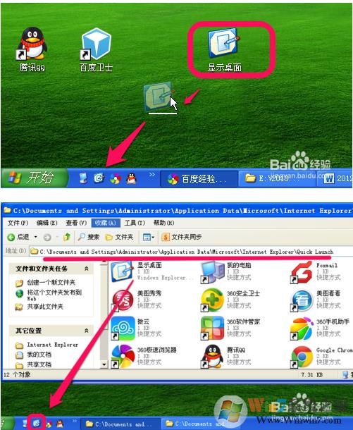 3、這時桌面就生成一個“顯示桌面.SCF”的圖標(biāo)了。如果你想把它放到任務(wù)欄,直接拖過去,或者復(fù)制放到這個目錄下就可以了“C:\Documents and Settings\Administrator\Application Data\Microsoft\Internet Explorer\Quick Launch”。如圖所示。