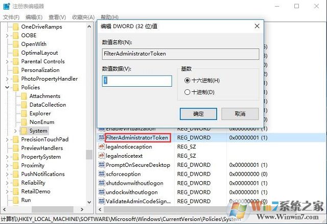 2.在打開(kāi)的注冊(cè)表編輯器窗口中,咱們依次點(diǎn)擊展開(kāi)左側(cè)菜單中的HKEY_LOCAL_MACHINE\SOFTWARE\Microsoft\WindoWs\CurrentVersion\Policies\System,之后,咱們?cè)谟覀?cè)窗口中找到FilterAdministratorToken選項(xiàng)并雙擊打開(kāi),在打開(kāi)的編輯窗口中,咱們將數(shù)值數(shù)據(jù)改為“1”后點(diǎn)擊“確定”保存設(shè)置。