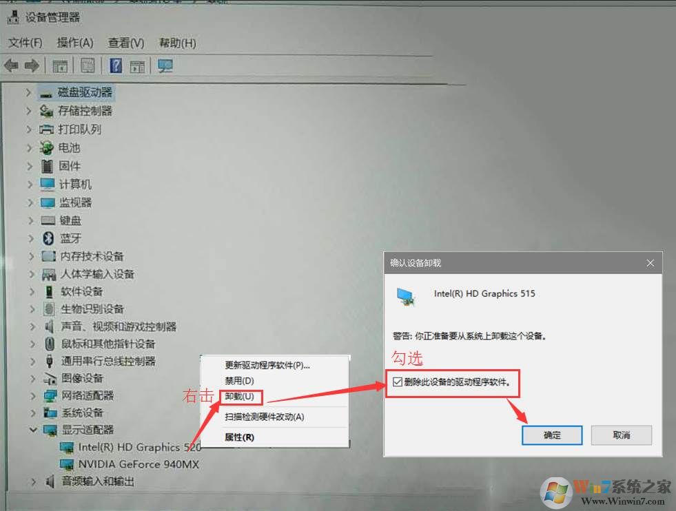 3、在設(shè)備管理器界面點(diǎn)擊“顯示適配器”打開(kāi),找到intel開(kāi)頭的設(shè)備,右擊點(diǎn)擊“卸載”,勾選“刪除此設(shè)備的驅(qū)動(dòng)程序軟件”,點(diǎn)擊“確定”。卸載成功后重啟電腦。