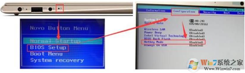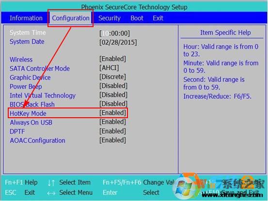 2、進(jìn)入BIOS后,移動(dòng)到第二個(gè)選項(xiàng),“Configuration”,找到“Hotkey Mode”熱鍵模式選項(xiàng),默認(rèn)為“Enable”開(kāi)啟狀態(tài),即F1-F12為媒體功能;