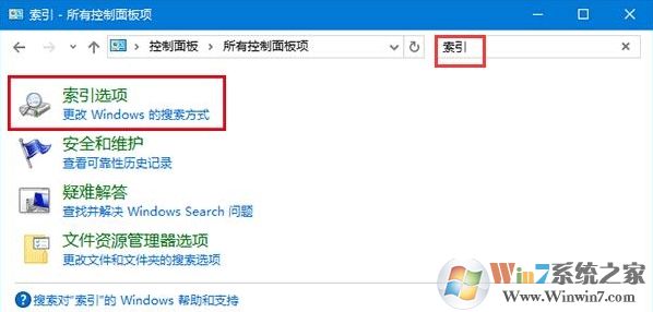 3、打開(kāi)控制面板,在控制面板右上角搜索框中輸入“索引”,在搜索出來(lái)的選項(xiàng)中點(diǎn)擊“索引選項(xiàng)”,如圖: