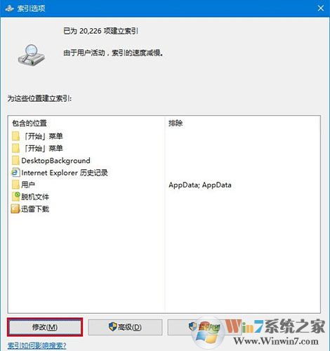 4、接著在索引選項(xiàng)窗口中點(diǎn)擊“修改”按鈕,如圖: