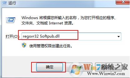 1、首先使用組合鍵(win鍵+r)打開運行窗口,并輸入“regsvr32 Softpub.dll”命令,再點擊“確定”按鈕,如下圖所示: