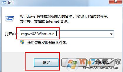 3、重新打開運行窗口,輸入“regsvr32 Wintrust.dll”命令,點擊“確定”按鈕,如下圖所示: