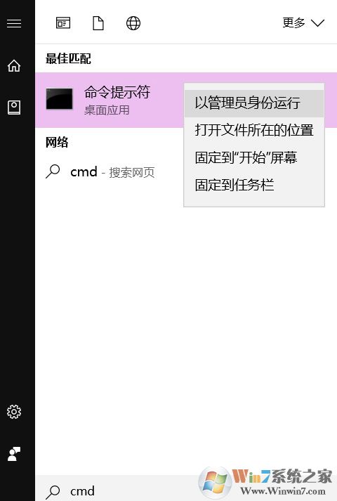 1、首先,在開始菜單輸入cmd,在命令符模式下點擊右鍵選擇“以管理員身份運行”(Win7請在開始菜單的運行中輸入)