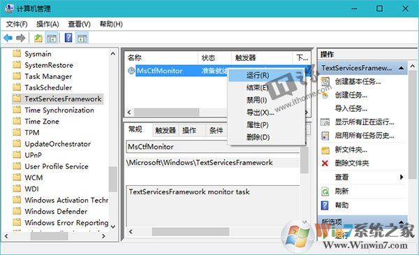 2、在計算機管理的系統(tǒng)工具——任務計劃程序——任務計劃程序庫——Microsoft——Windows中找到TextServicesFramework,如下圖所示,在右側(cè)可以看到名為MsCtfMonitor的任務計劃程序,右鍵單擊MsCtfMonitor,選擇“運行”即可。