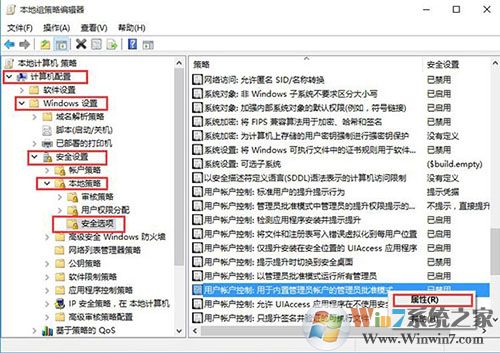 2、打開本地組略編輯器,點(diǎn)擊“計(jì)算機(jī)配置-windows設(shè)置-安全設(shè)置-本地策略-安全選項(xiàng)”,點(diǎn)擊安全選項(xiàng)之后會(huì)出現(xiàn)很多策略組,點(diǎn)擊鼠標(biāo)滑動(dòng)找到“用戶帳戶控制:用于內(nèi)置管理員帳戶的管理員批準(zhǔn)模式”選項(xiàng),右鍵點(diǎn)擊屬性打開;如圖所示: