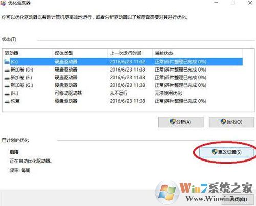 3、在優(yōu)化驅(qū)動器界面,點擊下方的“更改設置”,如下圖所示:
