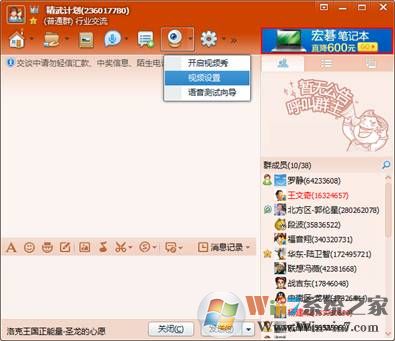 2、打開QQ群聊天界面,點擊攝像頭圖標右邊的小三角形,在彈出的列表中點擊,視頻設置,即可進入視頻設置界面;