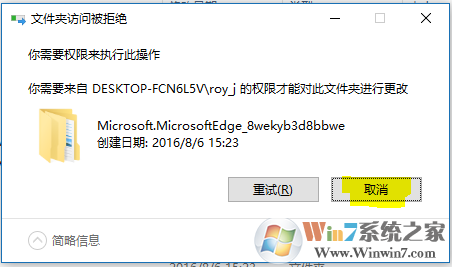 5、使用鼠標(biāo)雙擊打開這個(gè)Microsoft.MicrosoftEdge_8wekyb3d8bbwe文件夾,選中里面的所有內(nèi)容,并刪除它們,當(dāng)有權(quán)限提醒時(shí),請(qǐng)點(diǎn)擊“繼續(xù)”,直到無(wú)法點(diǎn)擊繼續(xù)后,點(diǎn)擊取消,此時(shí)應(yīng)該會(huì)只剩下AC這一個(gè)文件夾在里面,這個(gè)無(wú)傷大雅,如圖: