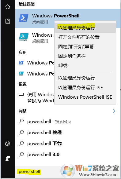 7、按下鍵盤上的Windows + S組合鍵以打開搜索框,輸入Powershell,使用鼠標(biāo)右擊搜索到的“Windows PowerShell”選擇以管理員身份運(yùn)行,如圖: