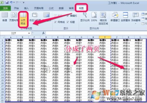 如圖,點(diǎn)擊視圖——》分頁預(yù)覽,你會(huì)看到我的橫排的內(nèi)容多,被分成了兩頁。