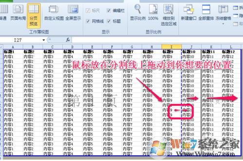 4、你會(huì)看到分頁之間有一條分割線,這個(gè)時(shí)候你可以把鼠標(biāo)移到線上,等鼠標(biāo)變成雙向箭頭的時(shí)候,按住鼠標(biāo),拖動(dòng)你想要的位置,左右拖動(dòng)都可以,如圖。